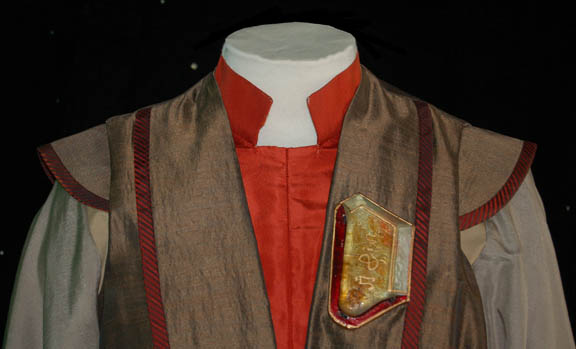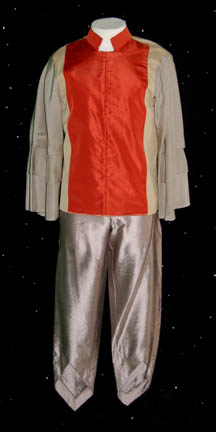 Description: A Vulcan costume worn by LeRoy D. Brazile during his portrayal of a younger “Tuvok” in the episode “Gravity” of Star Trek: Voyager. We see this costume during flashback sequences involving Tuvok's training to suppress his emotions. It is made up of thin shiny beige colored pants with chevron cut ankles and a burnt orange colored shirt with tan sleeves that have overlapping folds on the forearm, all covered by a shiny brown vest with featuring a ‘Vulcan’ character letter badge on the left side. The sewn in Voyager tags are inscribed ‘LeRoy Brazile’.