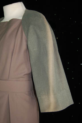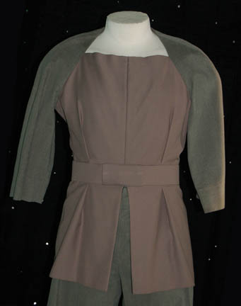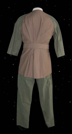 Description: When “U.S.S. Voyager” found its way to the edge of the ‘Nekrit Expanse' they came across a damaged Borg Cube ship and a stranded group of aliens who were formerly Borg. They lived together on the surface of a hospitable world and worked generally together until a disaffected group attempted to take control. While “Commander Chakotay” (Robert Beltran) attempted to alleviate the dangers of a society built on discord, the compromising element within the group eventually won over by reactivating their ability to communicate through Borg technology. The costumes of these aliens were similar in cut and build, made from local fibers. This costume is one of them; a pair of pants with black elastic stirrups and suspenders with a jacket that opens around the collarbones and has half length sleeves. The costumer’s tag reads ‘Unity’ and ‘stunt’.