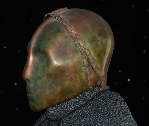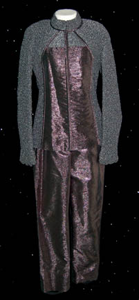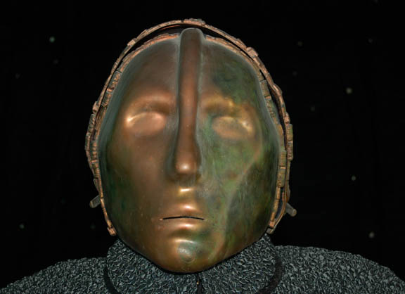 Description: From the episode “Prototype” of Star Trek: Voyager, this costume worn by vertran Star Trek actor Rick Worthy during his portrayal of “Cravic Automated Unit 122”. The episode revolves around a pair of robot races still fighting a war that ended in their creator's destruction many years before. When “U.S.S. Voyager” arrives in their space “B’Elanna Torres” (Roxann Dawson) is asked by the robots to create more of them to carry out their annihilation of the other side. The costume is a two piece black and red iridescent bubble suit with a metallic copper and green rust colored plastic mask which fits around the head with Velcro size adjustments and affixed details. Rick Worthy also appeared in Star Trek: Enterprise at the Xindi-Arboreal scientist, “Janar”, and currently plays a recurring role on “Battlestar Galactica” as a ‘Cylon’.