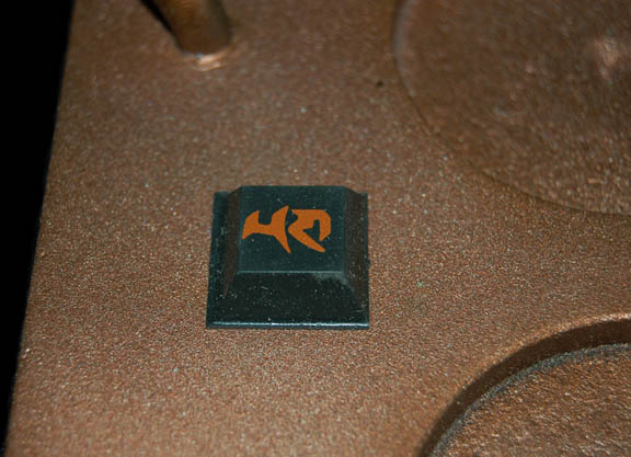 Description: The Klingons are a humanoid warrior race seen throughout the Star Trek series, but this Klingon tray is specifically from the Enterprise series identified by the style of Klingon buttons on each end of the tray. Made of particleboard with metal handles, the entire tray has been painted with textured copper colored paint. Five stickers and two raised rubber buttons have also been added that all bear Klingon style script. Believed to have been used in the Star Trek: Enterprise episodes "Affliction" and "Divergence" it measures approx. 14 x 7 x 2 ½ inches.
