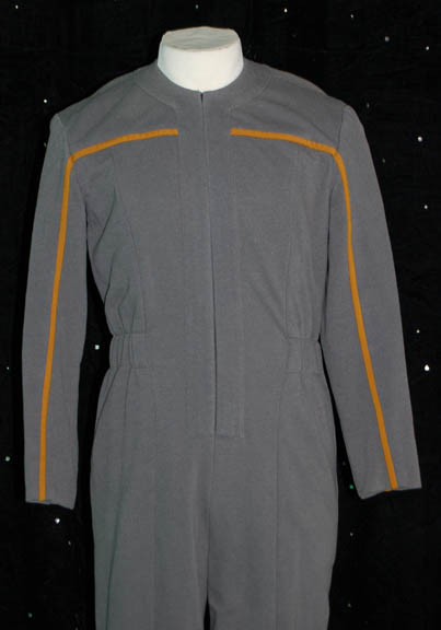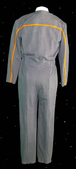 Description: A Starfleet uniform jumpsuit that is a departure from its contemporaries, this heavy fabric uniform was featured in the Star Trek: Voyager episode “Friendship One”. Worn by “Lt. Joseph Carey” (Josh Clark) for his memorable role as a recurring character. The costume is gray with an ‘operations gold' stripe, it zips up the front and clasps at the top, and has black elastic stirrups. The sewn in Voyager tag is inscribed ‘Josh Clark’.