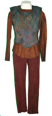 Description: “Gul Dukat” (Marc Alaimo) was a Cardassian who in 2375 took on the appearance of a dead Bajoran “Anjohl Tennan” by surgically altering his appearance. This costume lot is what he wore as “Anjohl Tennan” in the Star Trek: Deep Space Nine episode “Strange Bedfellows”. The lot consists of gray lined jacket with a lighter gray twisting line pattern covering its entirety. It is held closed with a brown leather belt that fastens with Velcro. Worn under the jacket is a multicolored square-neck vest that discreetly zips at the front. There is an additional identical waistcoat (included) that was made for Marc Alaimo but according to the accompanying tag was not worn on the show. Under the waistcoat is a brown undershirt with a rounded bottom and darkening at the end of each sleeve. It has a zip up the back and like the waistcoat has a square-neck line. The costume is completed with gray and maroon woven pants that zip at the front and have black elastic stirrups. Each item has an identifying label attached to it indicating its use by Marc Alaimo on Deep Space Nine.
