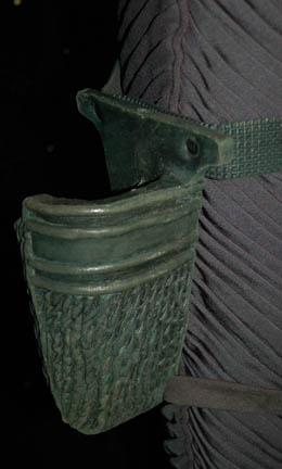 Description: The costume top is made of cast latex with a ‘division' strip attached in the inset of the right breast, a style unique to the ‘Cardassians’ from Star Trek: Deep Space Nine, made to be worn over a Spandex jumpsuit with ribbing running down the legs and stirrups that go inside rubber boots, which include cast latex gaiters matching the costume. Also included is a cast holster for a ‘Cardassian’ disruptor pistol on a belt that fastens at the waste and around the thigh. Additionally, a molded rubber ‘wrist communicator’ that attaches via Velcro is included as are plastic elbow and rib 'scales' that attach with velcro and snaps. The interior costume department tags indicate wear by various actors.