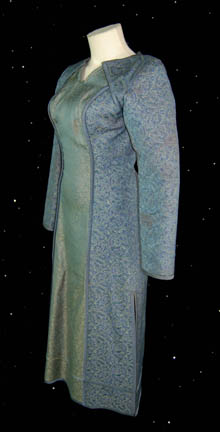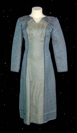 Description: Worn by the third incarnation of “Ziyal” (Tracy Middendorf) in the episode “For the Cause” wherein the character was executed by “Damar” (Casey Biggs) for aiding rebels attempting to retake “Deep Space Nine” from the Cardassian-Dominion occupying force during the Federation-Dominion War. Two gold patterned blue dresses with two tone silk over neoprene, one with a special effects ‘shoulder wound', and a pair of matching tights and detachable shoulder pads. Costume tags indicate wear by ‘Tracy Middendorf’.