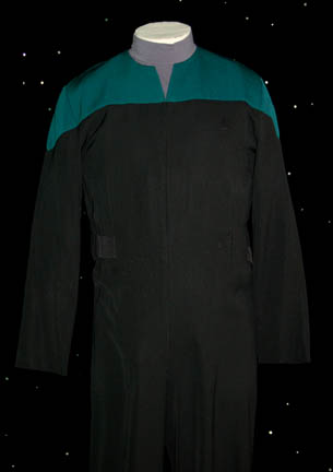 Description: This Starfleet uniform jumpsuit is black with blue sciences division shoulders that zips up the front and clasps at the top half way up the chest, and features a Velcro patch on the left breast for a Starfleet ‘combadge' (sold separately). The waist features form fitting black elastic with sewn in loops for ‘away team’ gear, the feet end in black elastic stirrups. Each uniform comes complete with detachable shoulder pads and a gray turtleneck undershirt that zips up the back and clasps at the top.