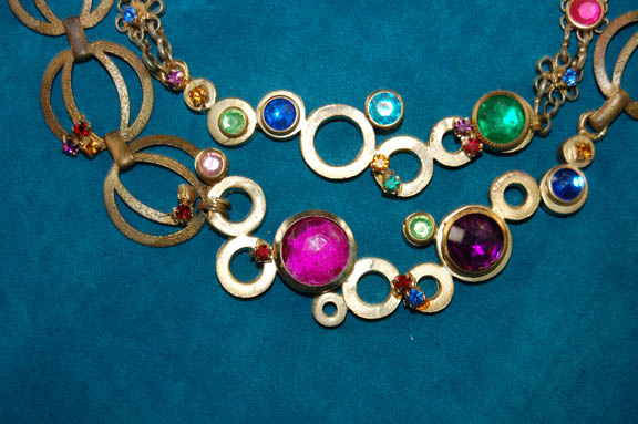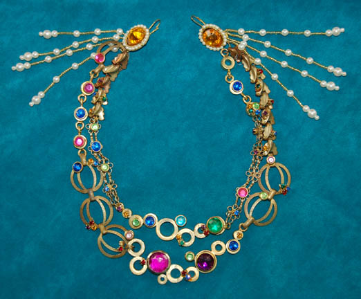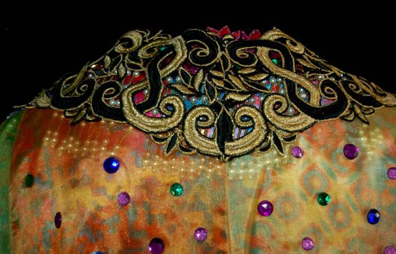 Description: This great costume was worn by Quark (Armin Shimerman) in the memorable Star Trek: DS9 episode “Profit and Lace” where he was required to masquerade as a female “Lumba” in order to prove to the Ferengi commissioners that Ferengi females are intelligent and should be granted the right to wear clothes. The costume includes a padded female bodysuit that zips up the back and has a small zip at the front for bathroom necessities! There are two identical brightly colored psychedelic jumpsuits that were worn over the bodysuit. They both have jeweled flower necklines and chests with strings of beads hanging freely underneath them. There is a sheer multicolored scarf that ties around the waist with gold and faux pearl bead tassels at the ends. Over the jumpsuit is a shear sleeveless robe in bright multi colors with at least a hundred colored plastic jewels glued on. It has an embroidered neckline that plunges down the front and there is a label attached that indicates it needs repair under the arm along the seam. The costume comes with black and yellow high heeled shoes that have sequined flowers and jewels across the toes and clear acrylic heels. To complete the outfit is exotic looking Ferengi lobe jewelry that extends under the chin from one ear to the other. The inside tags on the costume reads “Deep Space Nine, Armin”. Costume comes complete with tags.