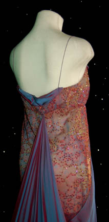 Description: A gown worn by stunt actress Denise Roberts while portraying “Major Kira” in Star Trek: Deep Space Nine. This sexy full-length patterned sequined gown features a blue/purple sash through which one arm fits.