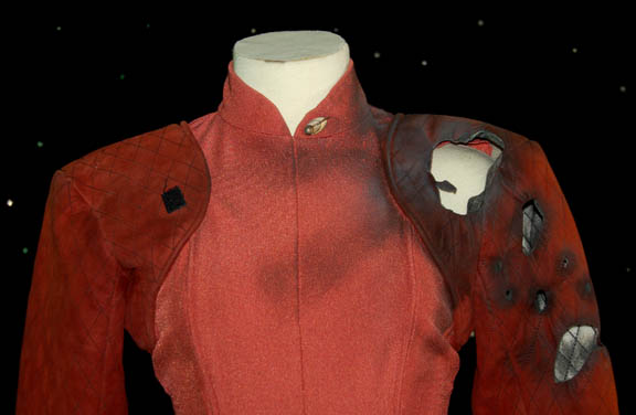 Description: A rust colored Bajoran military uniform with quilted sleeves and shoulders featuring the familiar black diamond thread pattern. From the “Major Kira” collection of costumes, this was worn by stunt actress Denise Roberts during the episode “Defiant” of Star Trek: Deep Space Nine and features an attached ‘major' rank, and a Velcro patch for a Bajoran combadge (sold separately), and clasps for a belt. The left shoulder features a degree of distress in that several holes are present with ‘scorch’ marks around them indicating a burn wound.