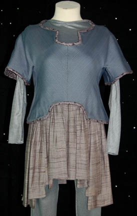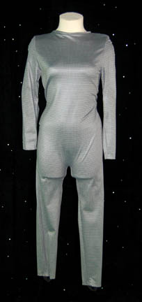 Description: This Cardassian costume was worn during the Deep Space Nine episode “Tribunal” and features a silver and black checkered jumpsuit that zips at the back and has stirrups at the feet. Over the top is a short sleeved smock in blue, gray and black fabrics. The top section is made of covered wetsuit material while the flowing lower section is made of linen. There is a double zip up the back. The accompanying costume tag reads “DS9 “Tribunal” – N.D. Jury, Cardassian Child”.