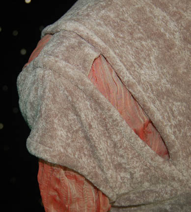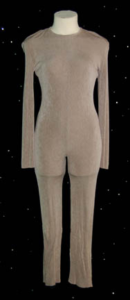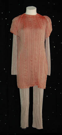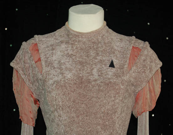 Description: STAR TREK: VOYAGER “KES” COSTUME A costume worn by Jennifer Lien in her portrayal of “Kes” in various episodes of Star Trek: Voyager like “Deadlock”. The costume is comprised of a jumpsuit, taupe and coral with a blouse and an over vest. Interestingly there are slits cut in the shoulders accenting the costume neatly. The costume also features a Velcro patch for a Starfleet combadge (sold separately), it does not appear to be a stunt costume, and the interior Voyager tags read ‘Jennifer Lien' as does the costumer’s tag.