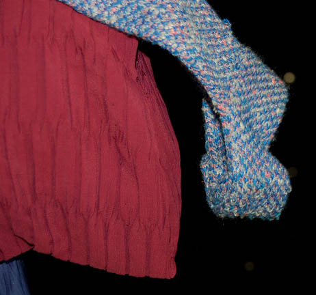 Description: When the Enterprise-D crew arrives at a planet that appears out of nowhere, every child aboard the ship is instantly transported to the surface. The reason for this becomes clear; the people on the planet hope to keep the children because their ability to reproduce has stopped! This costume is a blue and burgundy crimped fabric jumpsuit with knitted shoulders worn in the episode “When the Bough Breaks” of Star Trek: The Next Generation. The shoulders extend past where they join the jumpsuit to Velcro around the arms.