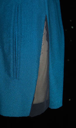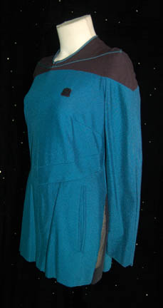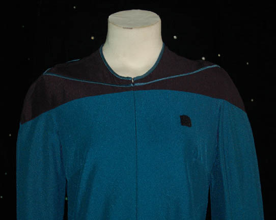 Description: A rich blue Starfleet medical uniform top worn by Diana Muldaur while portraying “Dr. Katherine Pulaski” on Star Trek: The Next Generation season two while “Dr. Crusher” (GatesMcFadden) was the head of Starfleet Medical. Flared under the waist to accompany missing black uniform pants and with sciences blue piping around the neck above the black shoulders, this uniform also stands out as one of the only 24th century Star Trek costumes to feature pockets, even though they are faux. The costumer's tag is inscribed ‘Pulaski, Diana Mudaur’.