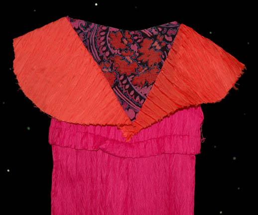 Description: These great little identical costumes were worn by “Alexandra” (Jessica and Vanessa Bova) one of the civilian children who lived onboard the U.S.S. Enterprise under Captain Picard during Star Trek: The Next Generation and was worn in the episode “When the Bough Breaks”. Alexandra was the youngest child on the U.S.S. Enterprise to be kidnapped by the Aldeans in their attempt to re-populate their ailing planet. Played by twins, the two identical costumes are sleeveless jumpsuits made of crimped pink fabric with orange epaulettes and a patterned V-neck at the front and back.