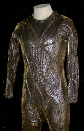 Description: A costume featured in the Star Trek: Enterprise episode “Unexpected”, yes, the one where “Trip” (Connor Trinneer) gets pregnant. This costume is made of a shiny silver material with a ‘dried Earth' pattern underneath a see-through gold mesh material with inset reflective shapes, conjoined by a series of vein-like tubes running up and down the extremities of this full length body suit. Even the matching shoes are made from the same materials. The costumer’s tag reads ‘David Walrod’.