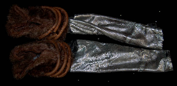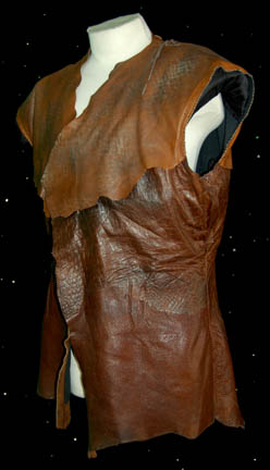Description: A Klingon costume top made with multiple pieces of brown and dark brown leather for various episodes of Star Trek: Enterprise. The costume comes with detached sleeves featuring matted fur shoulders brown leather tube rings around the upper arms, and sleeves made from ‘silver chain mail' aged to appear ‘distressed’ and with holes torn in the mail. The interior of the costume is lined with black nylon for comfort and the interior Enterprise tag reads ‘045’ indicating likely use in the episode “Judgment”.