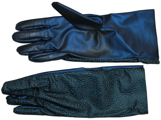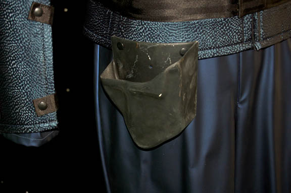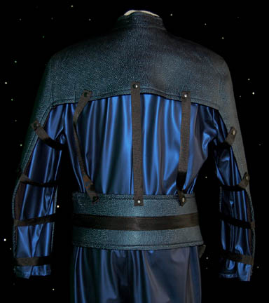 Description: An intricate navy blue vinyl jumpsuit with matching gloves and a Velcro affixed shoulder and arm wrap made from neoprene that snaps into place around the arms and to a matching harness at the waist. Presumably used by Talaxian miners on an asteroid in the episode “Homestead” of Star Trek: Voyager, this costume comes with a costumer's tag that indicates wear in the episode “Destiny”, the operating title of “Homestead” until it was realized that Deep Space Nine had already titled an episode “Destiny”. The harness also features a black vacuum formed holster affixed to it.