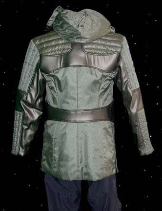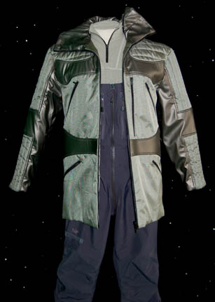 Description: During the Star Trek: Enterprise episode “Regeneration”, two Borg drones are discovered frozen in the Arctic by the Arctic Archeology Team ‘Researcher' (Adam Herrington). Unluckily for him and his scientific partner, the pair ends up being assimilated by the Borg. This is his Archeology team clothing and includes a heavy duty lined coat made of padded silver and green vinyl. It has a hood, multiple zipped pockets and two patches on the right sleeve. The upper patch is the “Earth Sciences Institute” logo and lower one is the “Arctic Archaeology Team 3” patch. Worn underneath is a grey/green long sleeve fleece top that zips at the neck. The accompanying dungaree pants are made by ‘Arc’teryx’ and are actually made for Arctic conditions. Made of blue nylon, they have a zip that goes from the front to the back, multiple zipped pockets and black elastic adjustable shoulder straps. Black snow weather gloves are also included. Costume comes complete with costume tag.