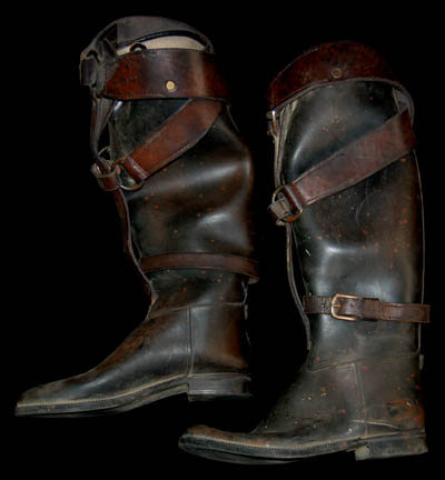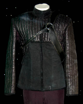 Description: A militaristic costume worn in the episode “Resistance” of Star Trek: Voyager. When “Captain Janeway” (Kate Mulgrew) is separated from her away team on a planet ruled by a tyrannical government she attempts to evade the security forces of the ruling faction until she can retrieve her captured crewmates. The ‘Mokra' government wore costumes like these; an impressive suede uniform jacket with quilted black leather shoulders and sleeves that zips up the front, with black spandex pants, and incredible leather boots with straps. The costume also features a harness that loops around one shoulder and around the ribs, latching in the back and a black plastic helmet with a clear facemask. The costumer’s tag reads ‘Resistance’ and a sewn in tag in the jacket indicates use in episodes of Star Trek: Enterprise.