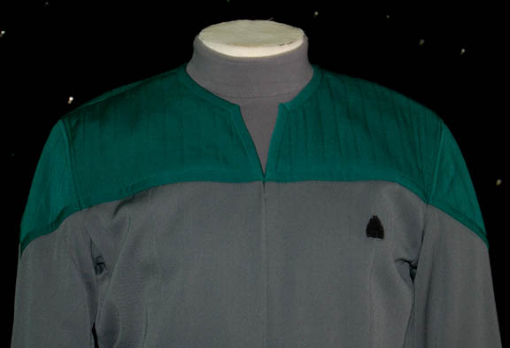 Description: Featured in the Star Trek: Deep Space Nine episode “Valiant” this specialized ‘Red Squad' cadet uniform is separated from other Star Trek cadet uniforms in some key areas. This costume is a full length gray uniform jumpsuit with quilted sciences blue shoulders and cuffs, form fitting elastic sewn into the waist with loops for ‘away team’ gear, sewn in pockets with closing top flaps, and a matching gray long sleeved turtleneck undershirt and detachable shoulder pads. The uniform features a black Velcro patch for a Starfleet uniform combadge (sold separately) and comes with a matching gray belt that clasps. Other Starfleet cadet uniforms are black with red shoulders, but Red Squad was the elite organization within Starfleet Academy and their uniforms stood out among the rest. The item features a costumer’s tag that indicates use on Star Trek: Deep Space Nine.