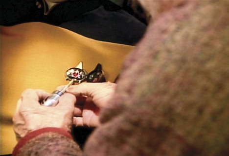 Description: (Paramount Television, 1987-1994) This special-effects communicator badge was worn by Brent Spiner as Data in the fourth season episode entitled <em>“Brothers”</em>. The badge comes custom framed in a glazed display on a laser cut mount board with two screen stills, set in a gold colored frame. The badge can be displayed opened or closed, so that the actual display can be opened up like a book, allowing access to the badge. The display has been wired with a switch that activates the LEDs.