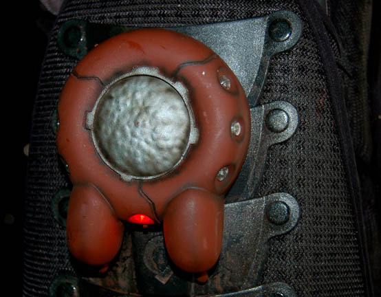 Description: Having entered the treacherous Delphic Expanse to locate the mysterious Xindi, the crew of “Enterprise NX-01” comes under attack by pirates from outside the Expanse! ‘Osaarians', board the ship and place numerous transporter tags onto various items within the cargo holds of “Enterprise”, stealing them, but not before the crew and MACOs engage them in a firefight. Their costumes are a patchwork of practical motorcycle jackets and pants with attached plastic ‘armor’, multiple belts and straps and buckles, and painted on distress. The right sleeve of the jacket features a Velcro patch for an affixed brown painted cast resin ‘transporter control’ with tested lights, one which shines red, and another set around the item that flash orange in sequence, all powered by a single 9volt battery that still holds a charge, activated by buttons on the exterior. The costume also comes complete with an elaborate pair of boots which feature leather straps and buckles. Sewn in Enterprise tags read ‘Tom Morga’.