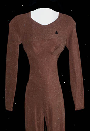 Description: This brown “Seven of Nine” (Jeri Ryan) costume features a Velcro patch for a Starfleet combadge (sold separately), has Velcro and clasp adjustments at the feet for high heels, and zips up the back. Worn in various episodes of Star Trek: Voyager like “Imperfection” the costumer's tag is inscribed ‘Jeri Ryan 7 of 9, Voyager, jumpsuit brown’.