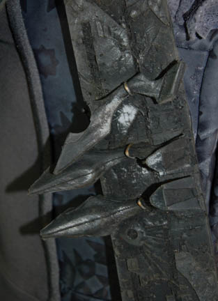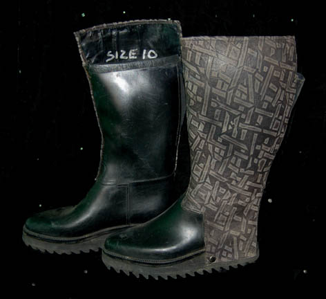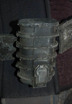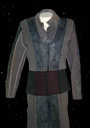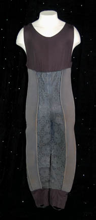 Description: The ‘Jem' Hadar’ are a military super power from the Gamma Quadrant who were genetically engineered by the ‘Founders’ to make them several times more powerful than humans. This ‘Jem’ Hadar’ uniform consists of a neoprene gray sleeveless jumpsuit with geometric patterning down the front and back and a zip at the front. The jacket is made of the same material with a matching design and leather attachments to the collar area. A black rubber harness that does up with Velcro is worn around the waist and over the shoulder. To accompany the uniform is a black vest with puckered fabric and black solid trim as well as a gun holster. The costume comes complete with matching boots and costume tags.