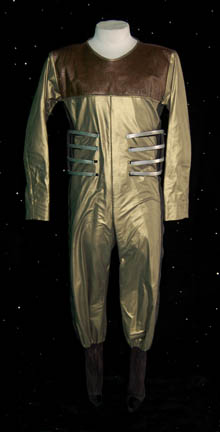 Description: The Son'a are a humanoid race decended from the Ba’ku who are known for their egotistical and materialist nature. They were featured prominently in the Star Trek IX: Insurrection feature where they were fighting a loosing battle to overcome the affects of aging without access to the regenerative effects of the Ba’ku planet’s metaphasic radiation. This uniform was worn by Son’a Officer #1 (Bruce French) and includes a gold colored vinyl jumpsuit with patterned shoulders. Down each side are black strips of capillary rubber, the bottom of each leg has black elastic stirrups and there is a zip up the back. There are also four metal ribs that Velcro onto each side. The lined waistcoat is made of pleated velvet with black bubbled latex trim. Three metal ribs Velcro onto each shoulder denoting rank. The knee high black boots are padded with four metal rings around each calf. The rings have become loose with time and may need to be attached more securely. The gloves are black leather, cotton and bubbled latex with a latex hand control on the back of the left glove. The costume comes complete with a Son’a cowl and metal skull plate.