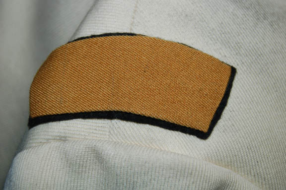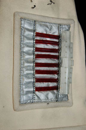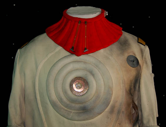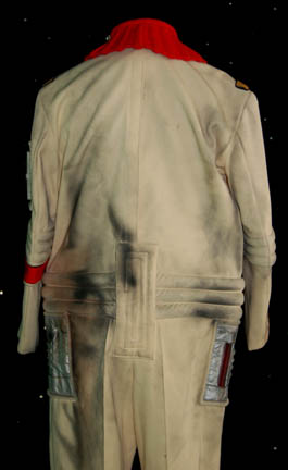 Description: This intentionally distressed jumpsuit is from the brilliant second Star Trek feature film “Wrath of Khan” and was used in the sickbay scenes after Khan (Ricardo Montalban) attacked the U.S.S. Enterprise. The lined off-white engineering protective suit has a padded target motif on the chest that has a metal center. The sleeves and waist also have padded bands with an extra red and gold band around the left sleeve denoting rank. A metal disk has been attached to the left side of the chest for detail along with two triple-hole metal rings for safety equipment. The outfit has a Velcro and snap combination at the back and a small zip at the front to allow the wearer to use the bathroom without taking the outfit off! Each pant leg has white elastic stirrups at the bottom. There are additional plastic attachments on the front and side for detail as well as an ‘Able Seaman' square metal rank pip on the lower left sleeve. A padded red collar is also included with plastic attachments for detail. There is burned distress to a large percentage of the suit, most notably on the right sleeve, right leg, left chest and back. The accompanying tags read “Daniel Wong – Cadet” and “Sickbay”.