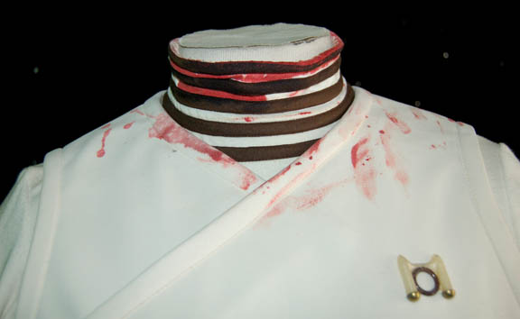 Description: A costume featured in Star Trek II: The Wrath of Khan, worn by a researcher from the “Regula I” space station where scientists were developing ‘Project Genesis'. The costume is cream colored trousers with Velcro at the ankles and a brown waist for wear with a matching fabric top that tucks into the pants, separated by a seam to a cottony upper portion. The sort sleeves are ringed and the collar is ringed with brown and white stripes. A vest is worn over the shirt made to appear double breasted with a purple area on the lower right that includes an opening where a circuit board is sewn in, on the lower right and a purple pocket in the front, the left breast features a sewn in plastic accent. The vest zips up the back. The costume comes with a costumer’s tag indicating wear in ‘Star Trek II’ and ‘Anthony as Steward’. The distress is evident In that special effects blood is apparent on the costume around the neck of the vest and shirt and minor spots are visible on the pants due to “Khan’s” (Ricardo Montalban) take over of the space station.