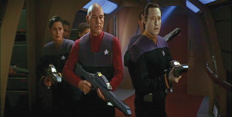 Description: (Paramount, 1996) Constructed of black and grey-painted resin with retractable strap and working sight that is wired for illumination. Used on-screen by Patrick Stewart in his role as “Captain Jean-Luc Picard” in <em>Star Trek: First Contact</em>. Measures 33 inches long and comes with a Letter of Authenticity by Set Decorator John Dwyer.