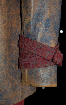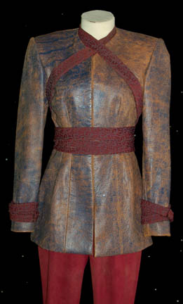 Description: A costume worn in the Star Trek: Enterprise episode “Divergence” by a female Klingon operative infected with the augmentation virus. The costume is made up of an extremely soft merlot colored sleeveless jumpsuit with an almost identical blue outer jumpsuit and a tan and blue leather jacket that zips up the front and has ties around the cuffs that clasp at their ends. The costume features a series of sewn n tags that indicate use by various actresses in various Star Trek series. One notable point is that the costumer's tag reads ‘Mareel, Invasive Procedures, Megan Gallagher’.