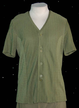 Description: This outfit was worn by “Dr. Phlox” (John Billingsley); a Denobulan who joined the NX-01 Enterprise after being recruited from earth. His shirt is green with striped detail, a V-neck and buttons up the front. The matching shorts are also green and button up the front. The inside tags each read “Enterprise, John Billingsley”.