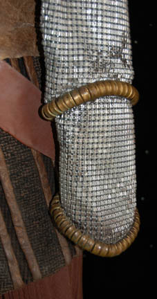 Description: This imposing Klingon costume was worn by various actors during the Star Trek: Enterprise series. The coat is made of pleated woven brown and tan fabric with brown leather trim. An assortment of leather pieces and brass fasteners has been attached to the shoulders for detail. The sleeves are made from a combination of faux fur and chain-mail at the bottom. Brass colored metal rings have been added around the chain-mail for decoration. The harness is made from an amalgamation of leather pieces over a fabric frame complete with leather rope style details and leather stitching. The outfit is complete with chocolate brown color pants that have pleats down the front and back and stirrups at the feet. There is a small hole in the crotch along the seam and slight distress in the back. The sewn in tag indicts that this item was worn on Star Trek Enterprise by at least four different actors including Vince Deadrick.