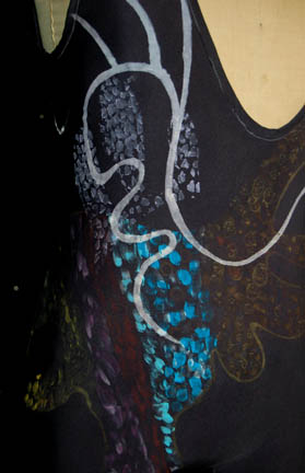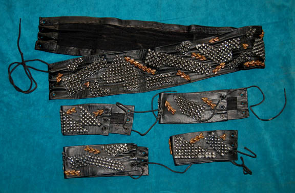 Description: A costume featured in the Star Trek: Voyager episode “The Thaw” wherein “Voyager” crewmembers are trapped in a nightmarish reality and encounter “The Clown” (Michael McKEan) who at one point threatens to execute them. The “Executioner” was played by Henry Reichenbach as described by the costumer's tag and his costume was this black full length leotard with painted on circus –like accents and a set of arm bands and a belt with attached metal stud details.
