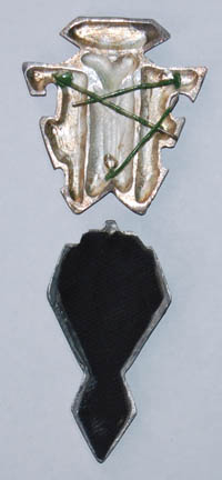 Description: Two cast metal emblems darkened to appear aged, made for use on “Lt. Cmdr. Worf's” (Michael Dorn) Klingon baldric sash in episodes of Star Trek: Deep Space Nine, though variations of these have appeared on other wardrobe. The upper piece features ‘Klingon’ character letters and wire backing, the lower piece has Velcro backing and holes for stitching to costumes.