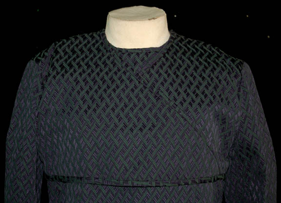 Description: A costume featured in the Star Trek: Voyager episode “Sacred Ground” made for the “Magistrate” character played by veteran Star Trek actor Harry Groener who also portrayed “Tam Elbrun” in the Start Trek: The Next Generation episode “Tin Man” and “Nathan Samuels” in the Enterprise episodes “Demons” and “Terra Prime”. This costume is made up of a two piece suit that is navy blue colored with green zigzags throughout. The costumer's tag indicates ‘Magistrate, Harry Groener’, another one indicates use by another actor, and the costume comes with detachable shoulder pads.