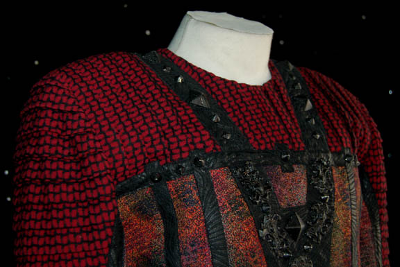 Description: A fantastic ‘Ilari' costume from the Star Trek: Voyager episode “Warlord”. Worn by “The Autarch” of the Ilari government this costume is multi-colored red, green, and yellow patterned with pleated sleeves, black leather accents, and metal studs. The tunic is worn over a sleeveless black jumpsuit and the whole costume comes with a costumer’s tag inscribed ‘ND Autarch, Ilarian’.