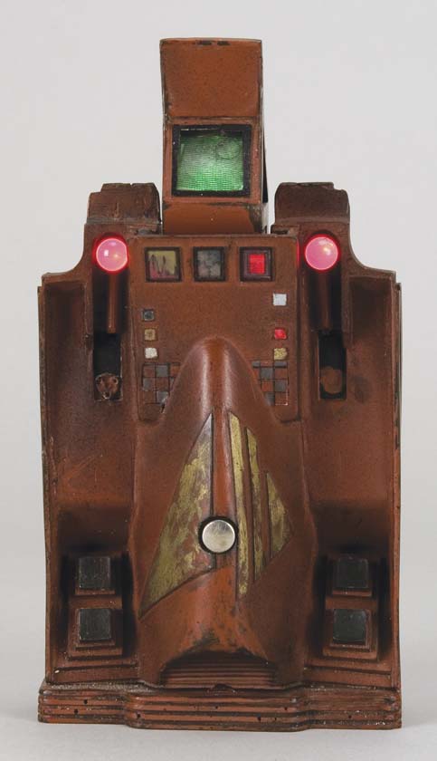 Description: (Paramount-TV, 1993-99) Working Klingon tricorder made of resin that is painted brown & black, with color detailing. There is a button trigger at the top that releases a small compartment at the front and illuminates the various LED lights. From Star Trek DS9. Measures approx. 7 in. in length.