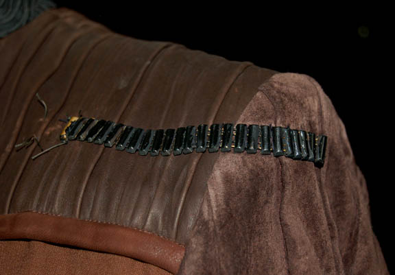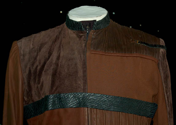 Description: When “Voyager” first encountered the ‘Krenim' they were a small, territorial species which posed little threat. However, as a large temporal ship continued its mission to restore a long lost line of history, the entire space around the Krenim Imperium changed and with it their ability to wage war. “Voyager” became trapped within their territory and was forced to fight for their lives against weapons that were capable to passing straight through their shields due to their state of temporal flux. This costume is part of the collection which depicts the Krenim in their height of power. Brown fabric pants with leather accents with a corresponding uniform jacket which zips up the front made from alternating pleated front leather and fabric. The chest features patterned strip sectioning the costume into a top and bottom and clasps under the right arm with a matching strip at the waist. A black metal accent lines the left breast under the collar and continues to the shoulder. The interior Voyager tag reads ‘John Thaddeus’.