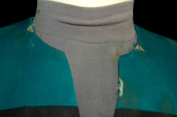 Description: A distressed sciences blue female Starfleet uniform jumpsuit made for various episodes of Star Trek: Voyager. This costume is black with blue shoulders and a gray long sleeved undershirt. Both items feature a degree of distress around the collar in the scope of burn marks, little holes, and tears. The same style of distress is evident on the left sleeve around the shoulder and minor holes are apparent in various places on the back of the uniform. A costumer's tag is inscribed ‘Voyager, female, distressed’.