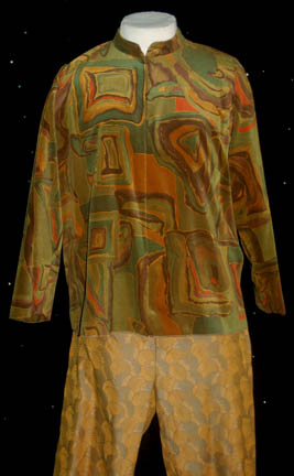 Description: This great costume was worn by “Neelix” (Ethan Phillips), a Talaxian who served as a chef onboard the U.S.S. Voyager during the Star Trek: Voyager series. This costume features a multicolored earth tone velvet shirt that zips up the front, a short sleeved green and yellow jacket that crosses over at the front and a pair of matching pants. All the items have a sewn in tag that reads “Voyager – Ethan Phillips”.