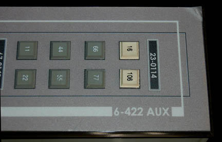 Description: This 21st century console panel was used as set dressing during the filming of Star Trek: Enterprise. The panel is made of acrylic with a silkscreen vinyl control panel and rubber faux buttons. A small piece of vinyl has become loose in the top left corner. The panel is on a corrugated white plastic frame that has silver tape detail making the panel interactive with the rest of the console. Measures approx. 3 ¾ x 9 ¾ x 4 inches.