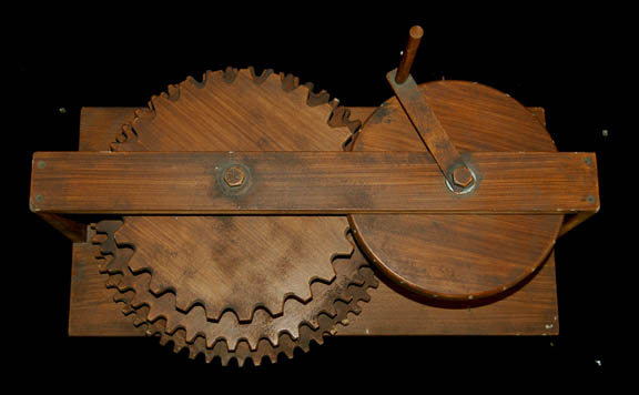 Description: A holoprogram used by “Captain Janeway” (Kate Mulgrew) of the “U.S.S. Voyager”, ‘Da Vinci's workshop’ was a place of amazing constructs and even more impressive ideas. Portrayed by John Rhys-Davies, “Leonardi Da Vinci” worked alongside “Janeway” asking life’s questions and attempting to solve them. “Da Vinci” appeared in several episodes like “Scientific Method” and “Concerning Flight”. This fascinating cog structure came from a set workshop devoted to the Da Vinci character. Made of wood, the piece is made up of a wooden base with three cogs of differing sizes on top. A metal pinwheel with a handle is attached next to the cogs that when turned makes the cogs spin around. Measures approx. 23 ½ x 14 x 16 inches.