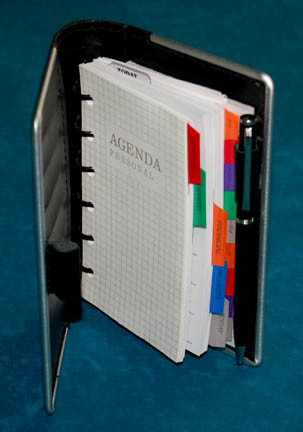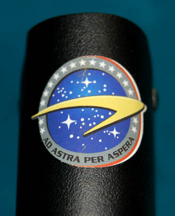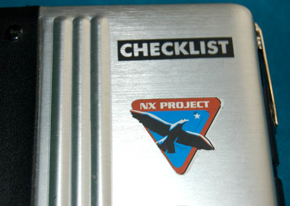 Description: This great little checklist book was featured in the Star Trek: Enterprise episode “First Flight” where flashbacks to “Captain Archer's” (Scott Bakula) time in the NX test program are shown. The book is an unused date planner with a metal case and vinyl black spine. Multiple labels including the ‘NX Project’ logo and the ‘Ad Astra per Aspera’ logo are adhered to the front and on the spine. A black pen slides into two slots to keep the book closed. Measures approx. 6 x 4 ¼ x 1 ¼ inches.