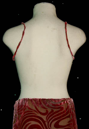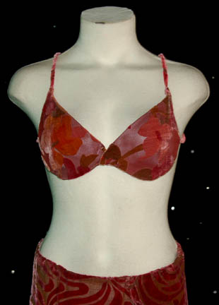 Description: A sexy costume featured in the pilot episode of Star Trek: Enterprise, “Broken Bow”. Worn by an alien ‘fire eater' performer this floor length wave patterned skirt features a slit up the leg and a near see through quality barring the sewn in undergarment and a matching bikini top. The costumer’s tag reads ‘Pilot, Fire Eater, Enterprise’.