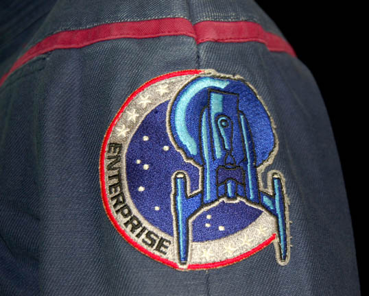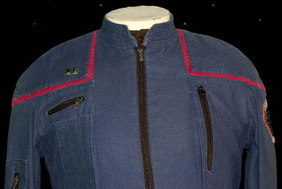 Description: A Starfleet uniform jumpsuit made from the familiar blue material with multiple zippered pockets and zip/Velcro size adjustments at the cuffs and ankles. With a form fitting elastic waist, engineering red division strips around the shoulders, and the famous ‘Enterprise NX-01' assignment patch sewn onto the left sleeve, as well as a pair of corresponding silver colored metal pips indicating the rank of ‘lieutenant’, this uniform stands out as one of the costumes made for and worn by Dominic Keating as “Lieutenant Malcolm Reed” in various episodes of Star Trek: Enterprise. The attached costumer’s tag reads ‘Dominic Keating, “Reed”, Star Trek: Enterprise, #R07’. The costume comes complete with a black button front sleeveless undershirt; both garments feature sewn in tags reading ‘Dominic Keating ’, the one in the uniform also reads ‘Season 3’.