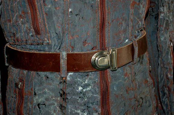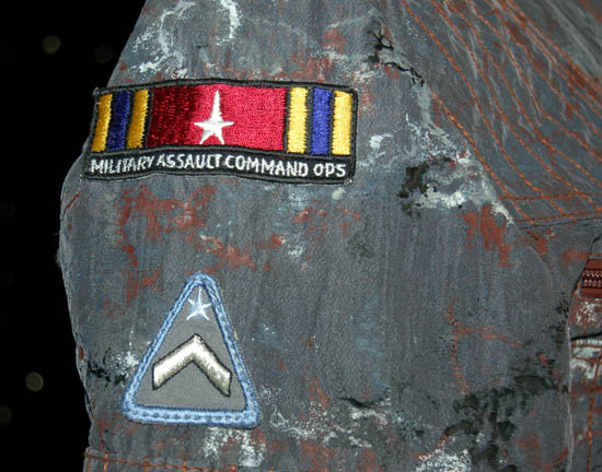 Description: The “evil Mirror Universe” of Star Trek is a place where our heroes are duplicated, though their personalities are vastly different due to their changed circumstances. The Federation has been replaced by a Terran Empire that rules by force and conquest instead of governing by diplomacy and democracy. Changes in the chain of command frequently occur and it is during that time that there is no one better suited to defend the status quo, or defeat it, than the MACOs (Military Assault Command Operations). They are not the “redshirts” of the classic Star Trek, nor are they part of “Enterprise's” pre-Federation Starfleet, but a group of highly dedicated soldiers that are part of the Terran Empire’s assault forces. They have a unique uniform and this item is one of them. It is made up of a brown undershirt, covered by a gray nylon uniform jacket that zips up the front; similar nylon pants with stirrups and a brown leather belt with metal belt buckle. Both jacket and pants are detailed with brown thread and the costume is loaded with zippered pockets. The sleeves on the uniform jacket are decorated; the left one with the MACO emblem patch featuring a cracked skull and the name of the soldier wearing the uniform, this one being “M. Romero”, and the right sleeve featuring the red bar with the classic Starfleet arrowhead with yellow and blue bars on opposing ends, and the rank of the soldier, this one being a ‘private’. The uniform also includes a pair of reddish-brown gloves and gray boots made from vinyl with canvas tops. The overall color of the entire lot (barring the gloves and undershirt) is gray with uniquely mottled white, black, and brown paint smudges thru ought to give it a “camouflaged” appearance. The sewn in Enterprise tag indicates use by various actors and the costume comes with a costumer’s tag.
