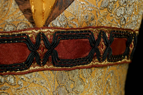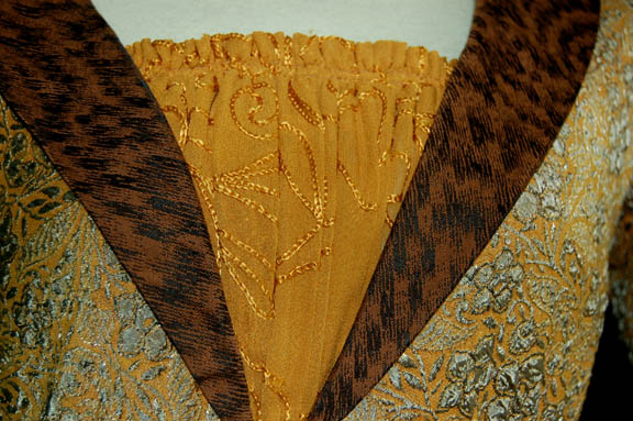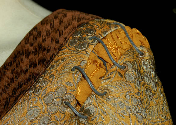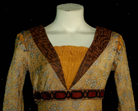 Description: “Riann” (Diane DiLascio) was an “Akaali”; a pre-industrial people who lived on a Class M planet similar to Earth. The Akaali and Riann were encountered by “Captain Archer” (Scott Bakula) in the Star Trek: Enterprise episode “Civilization”. Riann was a trained apothecary involved in trying to identify the strange illness that killed her brother. This is her costume that includes a floor length dress that's fitted at the waist and flowing at the bottom. It’s mustard yellow with a raised floral pattern design in gray. There is a stitched band under the bust and a V-neck with a mustard fabric center. The shoulders have a rudimentary stitched design. Worn over the top is a long hooded knitted robe in brown earthy colors. Costume comes complete with costume tag indicating wear by “Diane DiLascio”.
