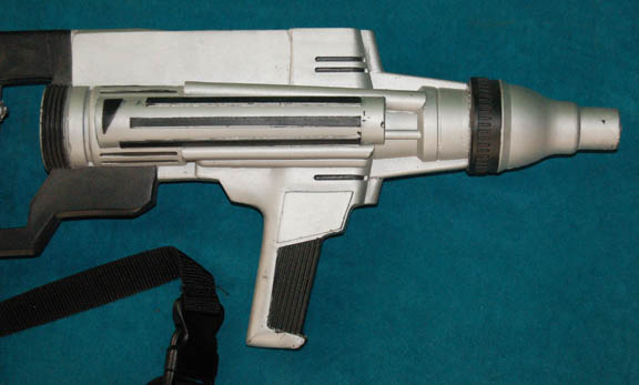 Description: The Enterprise era as depicted in the Star Trek: Enterprise series spanned the years 2151 to 2155. This Starfleet rifle from that time period was used during the filming of Enterprise. The rifle is made of cast black rubber with sections painted silver to resemble metal. A black adjustable strap is attached to the handle. Measures approx: 26 x 8 x 2 ½ inches.